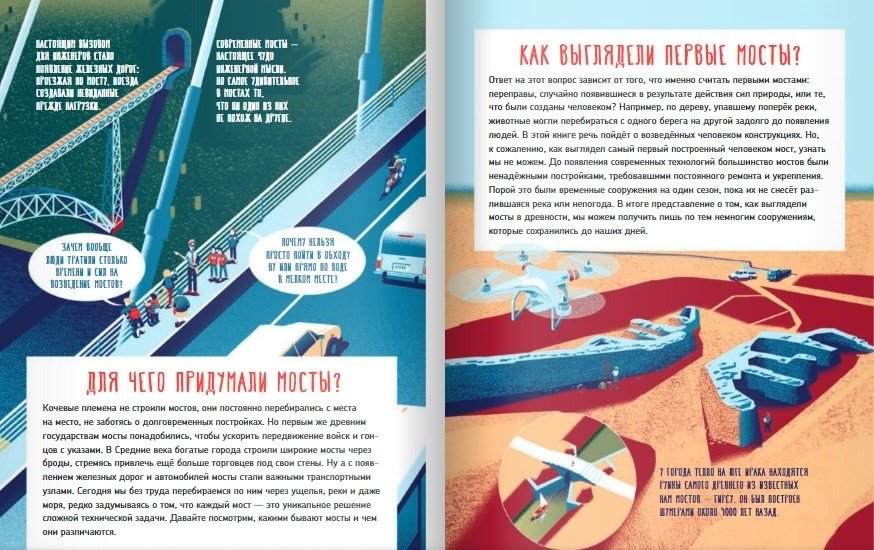 Новая книга от автора-иллюстратора Романа Беляева — о том, как устроены мосты. Как мосты возводят, какие задачи они решают, где находятся самые знаменитые и необычные мосты мира Роман рассказывает последовательно и наглядно, страница за страницей, путешествуя с читателем по временам и странам. Остается только восхититься с ним вместе чудесами инженерной мысли и красотой этих конструкций! Ведь нередко строителям мостов приходится искать (и находить!) поистине уникальные и оригинальные решения. И про каждый мост можно рассказать свою увлекательную историю. Первая книга Романа Беляева «Как работает маяк» выдержала уже множество переизданий на русском и издана на нескольких языках. Ее английское издание в 2019 году получило приз STEAM Children’s Book Prize как самая информативная детская книга.