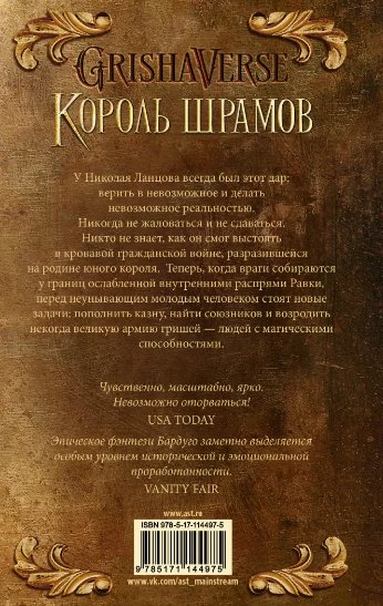 У Николая Ланцова всегда был этот дар: верить в невозможное и делать невозможное реальностью. Никогда не жаловаться и не сдаваться. Никто не знает, как он смог выстоять в кровавой гражданской войне, разразившейся на родине юного короля. Теперь, когда враги собираются у границ ослабленной внутренними распрями Равки, перед неунывающим молодым человеком стоят новые задачи: пополнить казну, найти союзников и возродить некогда великую армию гришей – людей с магическими способностями. Николай готов рискнуть всем, чтобы спасти страну, даже если для этого придется вытащить на свет секреты, которым лучше оставаться похороненными, и разбередить раны, которые никогда не заживут…