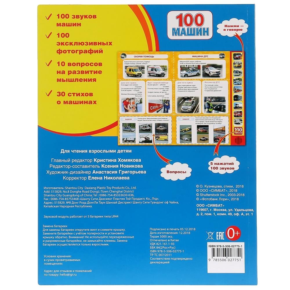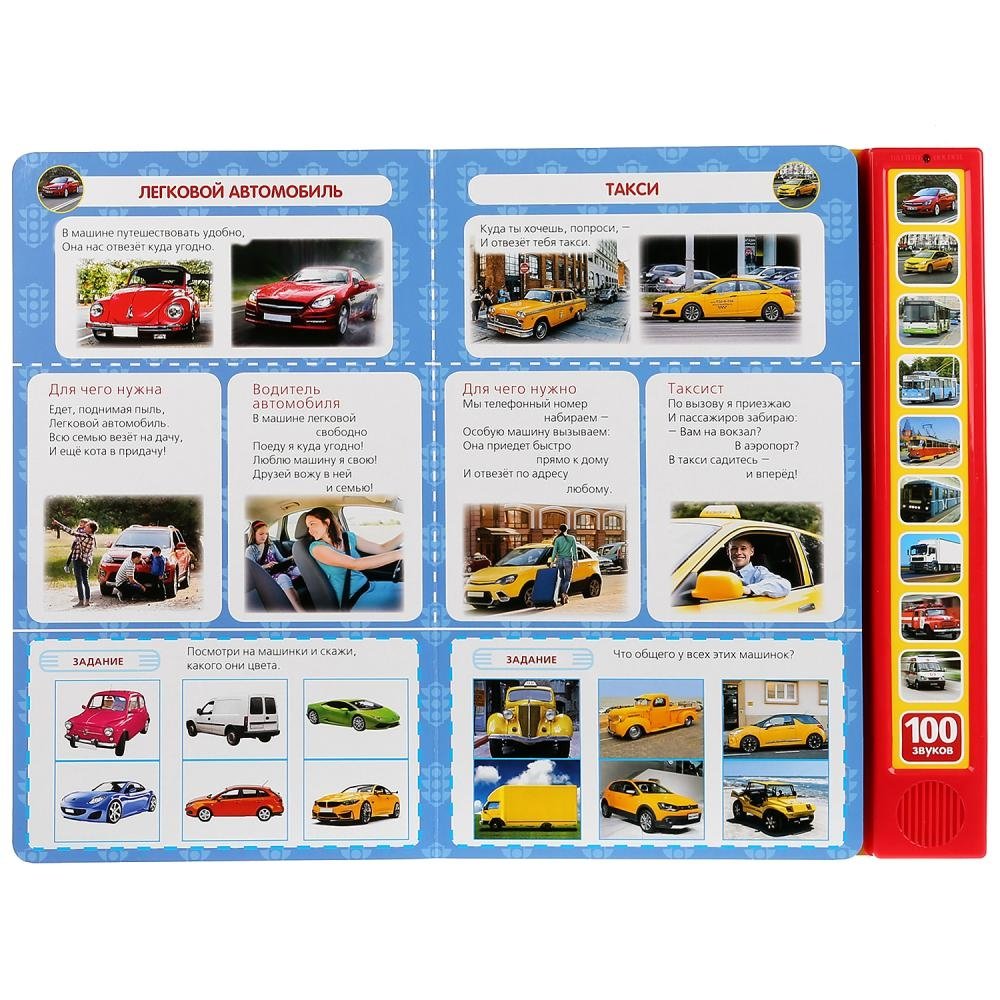 - книжка с "изюминкой" сразу привлечёт внимание: 10 звуковых кнопок на обложке при нажатии порадуют вас и ребёнка 100 звуками машин!