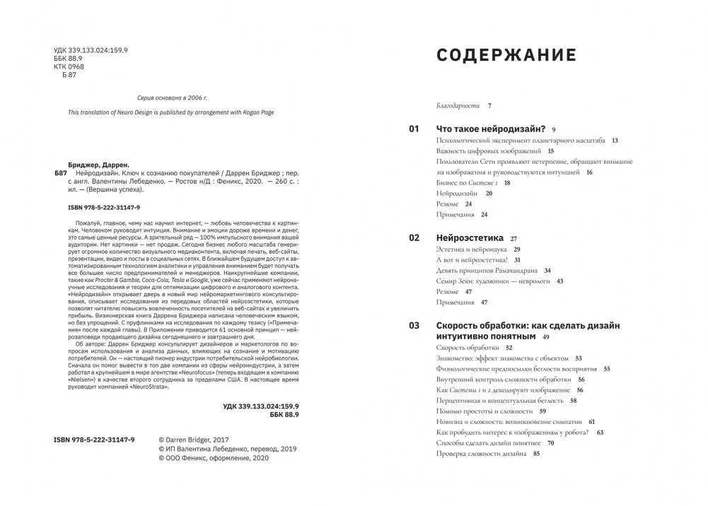 Пожалуй, главное, чему нас научил интернет, — любовь человечества к картинкам. Человеком руководит интуиция. Внимание и эмоции дороже времени и денег, это самые ценные ресурсы. А зрительный ряд — 100% импульсного внимания вашей аудитории. Нет картинки — нет продаж. Сегодня бизнес любого масштаба генерирует огромное количество визуального медиаконтента, включая печать, веб-сайты, презентации, видео и посты в социальных сетях. В ближайшем будущем доступ к автоматизированным технологиям аналитики и управления вниманием будет получать все большее число предпринимателей и менеджеров. Наикрупнейшие компании, такие как Procter & Gamble, Coca-Cola, Tesla и Google, уже сейчас применяют нейронаучные исследования и теории для оптимизации цифрового и аналогового контента. «Нейродизайн» открывает дверь в новый мир нейромаркетингового консультирования, описывает исследования из передовых областей нейроэстетики, которые позволят читателю повысить вовлеченность посетителей на веб-сайтах и увеличить прибыль. Визионерская книга Даррена Бриджера написана человеческим языком, но без упрощений. С пруфлинками на исследования по каждому тезису («Примечания» после каждой главы). В Приложении приводится 61 основной принцип — нейрозаповеди продающего дизайна сегодняшнего и завтрашнего дня.