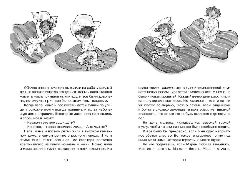«Жила-была большая-пребольшая семья: папа, мама и целых восемь детей… И ещё с ними жил небольшой грузовик, который они все очень любили. Ещё бы не любить – ведь грузовик кормил всю семью!» Вот так писательница представляет своих героев. Она рассказывает о жизни многодетной семьи, в которой родители всегда находят общий язык с детьми. Автор не скрывает, что любит своих героев, и её любовь передаётся читателям.