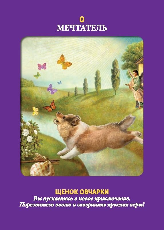 Дорин Вирче и Рэдли Валентайн (первая — веган, а второй — вегетарианец, оба страстные любители, защитники прав и спасатели животных) создали этот набор карт, чтобы вы получали чудесные послания от божьих созданий, больших и малых — от белого медведя до мышки и от пуделя до сенбернара. Каждая карта украшена великолепным изображением домашнего или дикого животного и содержит символическое значение. Прилагаемая брошюра с инструкцией объясняет, как читать и толковать смысл каждой карты