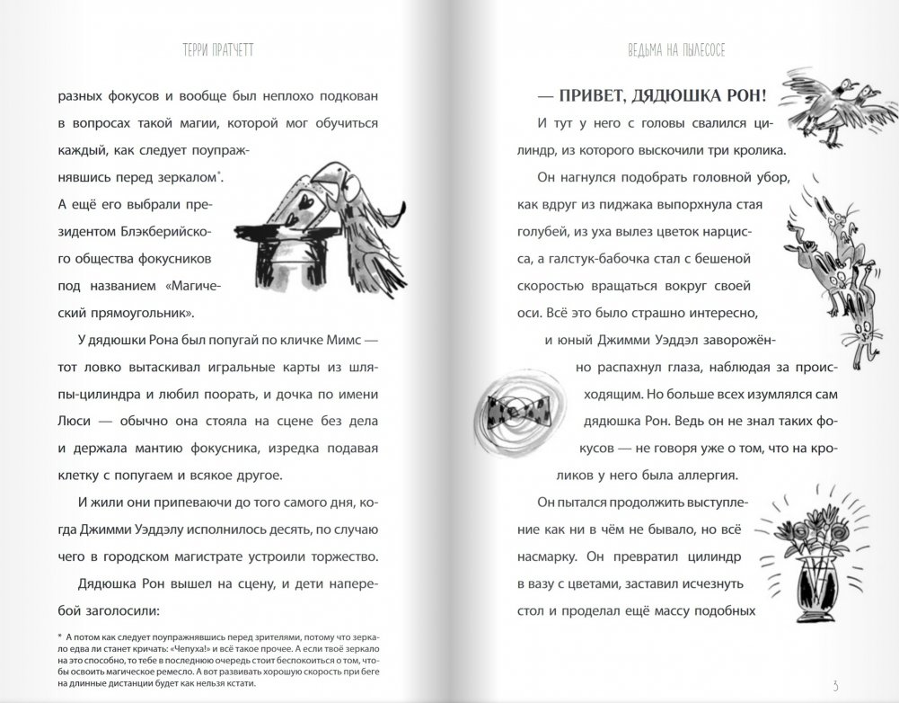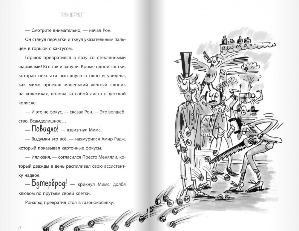 Ты веришь в волшебство? Можешь вообразить себе битву чародеев, подводную лодку размером с грецкий орех или машину времени в телевизоре? А незадачливого фокусника, который однажды утром увидел странный пылесос, а уже к обеду всё, к чему бы он ни притронулся, превращалось то в жёлтых слоников, то в сэндвичи с сыром, то в вешалку для шляп? Тогда мы приглашаем тебя в волшебный мир Терри Пратчетта! Здесь ты найдёшь четырнадцать невероятно смешных рассказов этого замечательного писателя. Тебя ждут пираты, прицельная стрельба мороженым, гномы, великаны, говорящие муравьи и другие чудеса! И, разумеется, ведьма верхом на пылесосе! Уморительно смешно!