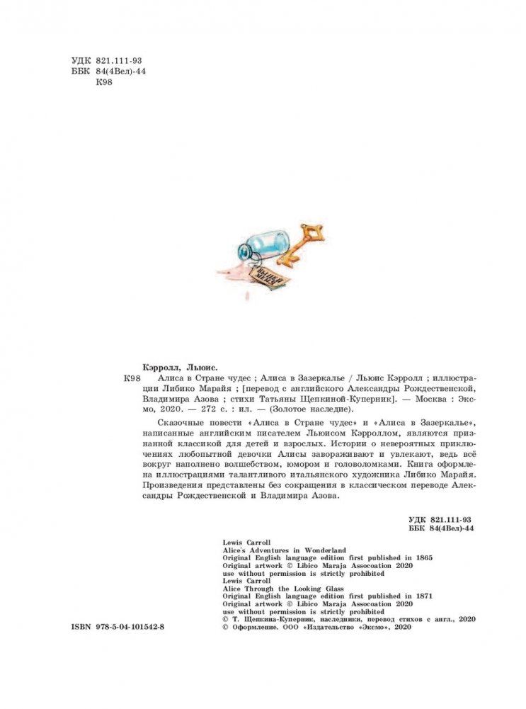 Сказочные повести "Алиса в Стране чудес" и "Алиса в Зазеркалье", написанные английским писателем Льюисом Кэрроллом, являются признанной классикой для детей и взрослых. Истории о невероятных приключениях любопытной девочки Алисы завораживают и увлекают, ведь всё вокруг наполнено волшебством, юмором и головоломками. Книга оформлена иллюстрациями талантливого итальянского художника Либико Марайя. Произведения представлены без сокращения в классическом переводе Александры Рождественской и Владимира Азова.