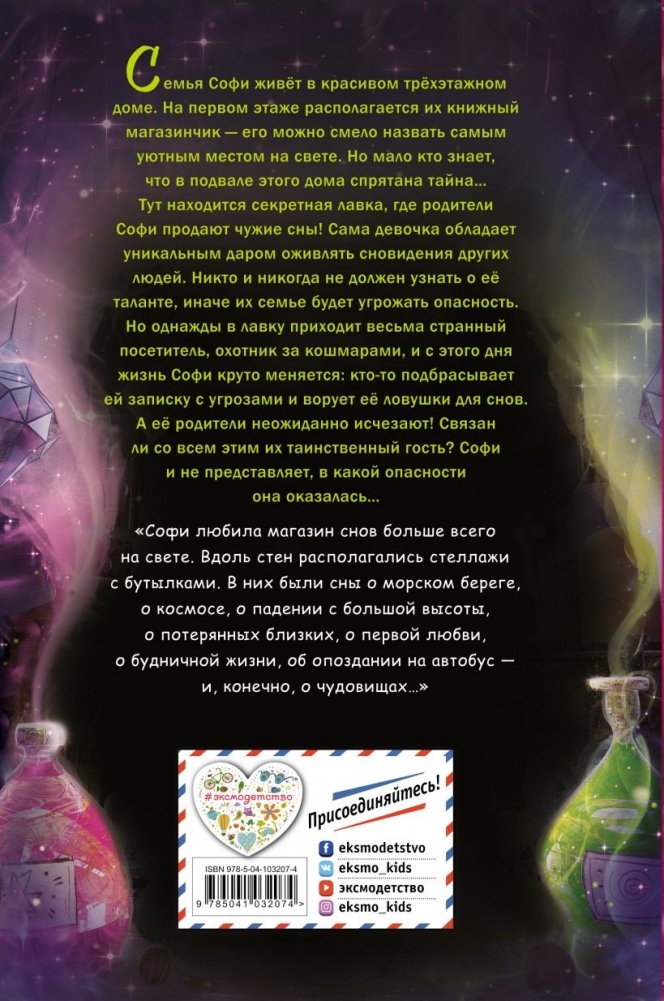 Семья Софи живёт в красивом трёхэтажном доме, на первом этаже которого располагается уютный книжный магазинчик. Но мало кто знает, что в подвале этого дома спрятана тайна… Тут находится секретная лавка, где родители Софи продают чужие сны! Однажды в лавку приходит весьма странный посетитель, охотник за кошмарами, и с этого дня жизнь Софи переворачивается с ног на голову. Кто-то подбрасывает ей записку с угрозами, а её родители… неожиданно исчезают! Связан ли с этим их таинственный гость? Софи и не представляет, в какой опасности она оказалась…