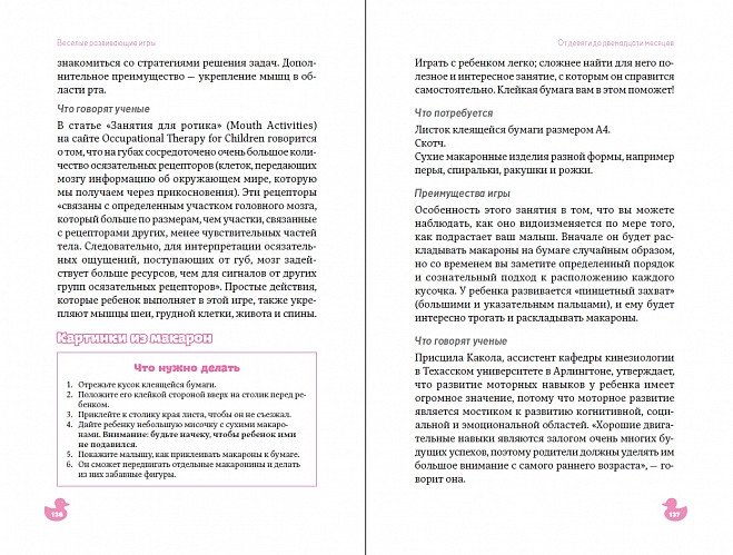 В этой книге вы найдете множество научно обоснованных описаний игр для детей от рождения до трех лет. Для каждой игры приведены инструкции, перечень необходимых материалов и подкрепленное исследованиями описание преимуществ, которые она дает. Все описанные в книге игры стимулируют развитие в одном или нескольких из пяти направлений: когнитивном, моторном, социально-эмоциональном, речевом и самооценки. Каждая игра помогает ребенку освоить какие то навыки. Некоторые из них, вероятно, покажутся вам знакомыми, так как они основаны на самых традиционных играх. Некоторые из них, рассчитаны на то, чтобы вы видоизменяли и додумывали их сами. И во все перечисленные в книге игры вы можете играть по своему.
