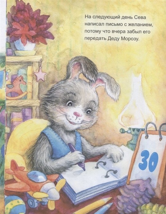 Скоро Новый год! Зайчик Сева с друзьями готовится к выступлению на утреннике в детском саду и в первый раз в жизни сам пишет письмо Деду Морозу. А что случилось дальше, вы узнаете из сказки, поучительной и полезной.