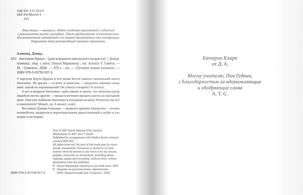 У ворчуна Берта Брауна и его жены Бетти завёлся маленький ангел, Ангелино. Их друзья — и дети, и взрослые — радуются милому созданию: какой он хорошенький! Он учится говорить! И летать! А вот и недруги Ангелино: одни умные и знают, что ангелам среди людей не место; другие — ушлые и мечтают продать ангела по выгодной цене. Они уже поймали Ангелино и посадили на цепь! Неужели так всё и закончится? Может, да. А может, и нет. Все книги Дэвида Алмонда — лауреата премии Андерсена — полны волшебства, мудрости и переосмысления представлений о добре и зле, норме и не-норме. И эта тоже! Она уже переведена на 14 языков.