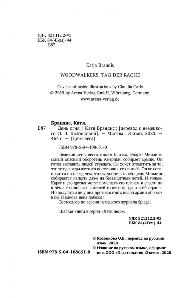 Великий день мести совсем близко. Энрю Миллинг, самый опасный оборотень Америки, собирает армию. Он готов заставить людей страдать. Он хочет отомстить за то, что те однажды жестоко поступили с его семьёй. Он не остановится ни перед чем, чтобы достичь своей цели. Миллинг собирается напасть даже на беззащитных детей. И только Караг и его друзья могут помешать его планам и спасти ни в чём невиновных жителей своего города и всей страны. Но получится ли у них противостоять целой армии оборотней? И какова цена победы? Бестселлер по версии немецкого журнала Spiegel. Шестая книга в серии "Дети леса".