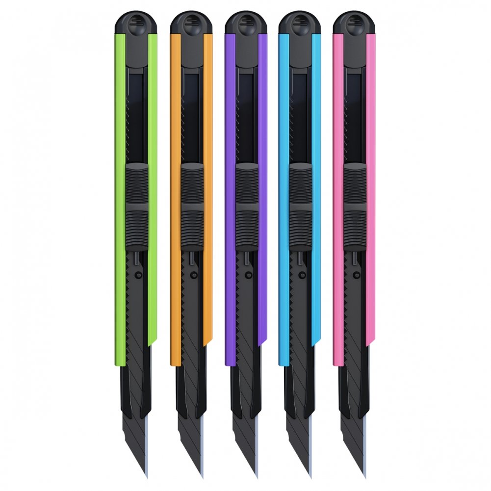 Нож канцелярский с автоматической системой фиксации лезвия auto-lock. Корпус ножа полностью металлический. Комплектуется износостойким стальным лезвием с углом 30 градусов черного цвета, для более легкого скольжения.