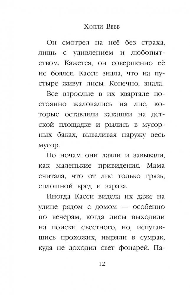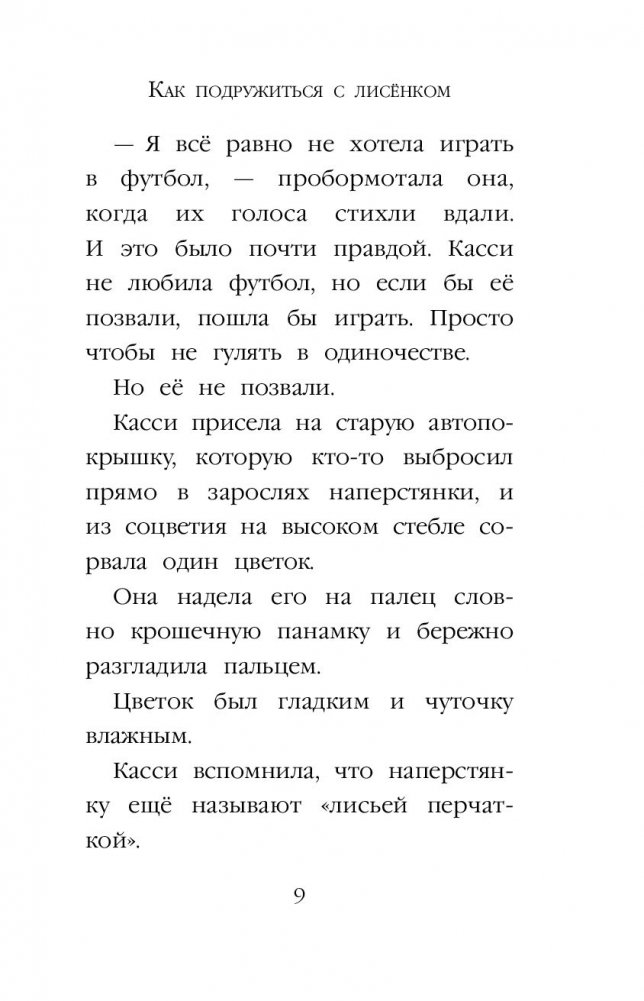 Касси уже достаточно взрослая, чтобы гулять только со старшим братом, но слишком маленькая, чтобы друзья брата согласились с ней играть. Поэтому она всегда гуляет одна, но неожиданно это оказалось… к лучшему. На пустыре за домом жили лисы, и Касси, тихой спокойной девочке, удалось с ними подружиться! Особенно ей нравился один лисёнок, самый рыжий. Он был настолько смелым, что пару раз даже ел колбасу из руки Касси!
