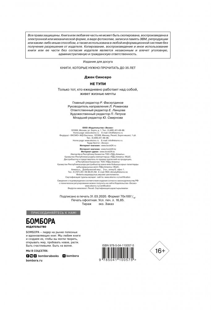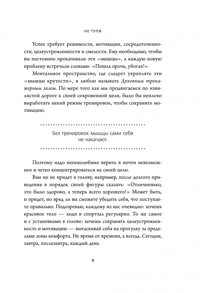 Книга «НЕ ТУПИ. Только тот, кто ежедневно работает над собой, живет жизнью мечты» — ваш личный тренер. Каждый день она будет поднимать боевой дух и заряжать на успех. Ее автор, знаменитая Джен Синсеро, призывает не сбавлять обороты на пути к успеху и ежедневно накачивать "мышцы крутости" в Духовном тренажерном зале. "Успех — это способ существования, постоянной адаптации и роста. Чем больше вы делаете для своего успеха, тем легче становится путь", — раздается боевой клич Синсеро.