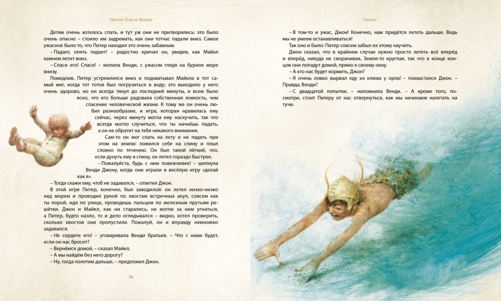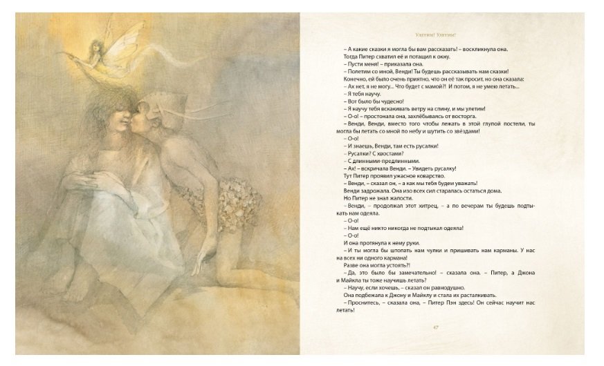 Удивительная история о сказочном мальчике, который не хотел взрослеть, давно поразила воображение детей и взрослых. Она началась с того, что однажды Питер Пэн влетел в окно детской в доме, где жили девочка Венди и двое её братьев. Вместе с Питером они отправились на далёкий волшебный остров. Там им встретились русалки, храбрые индейцы, озорная фея и даже пираты с их злобным главарём капитаном Крюком, судьба которого окажется в руках летающего мальчика. И тут героев ждут захватывающие приключения. Этой знаменитой книге особое очарование придают великолепные иллюстрации, созданные выдающимся художником к столетию первого издания «Питера Пэна».