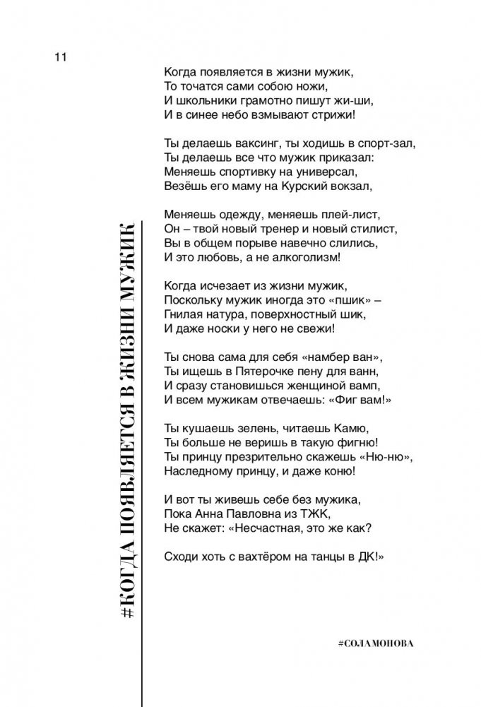 Сола Монова – самая читаемая поэтесса Рунета по количеству подписчиков. 1 000 000 подписчиков в Инстаграме, 500 000 – ВКонтакте. Узнаваемый стиль, оригинальная рифма, актуальные темы. Стихи Солы – не банальный пересказ классики, а настоящая современная поэзия.
