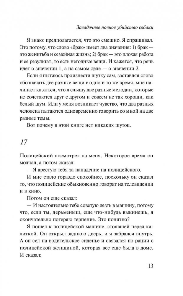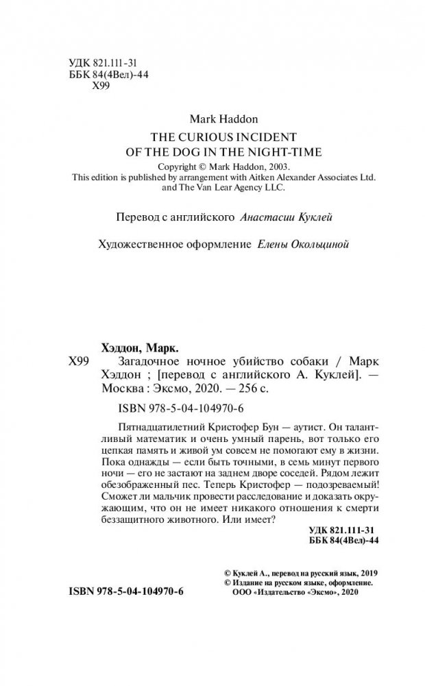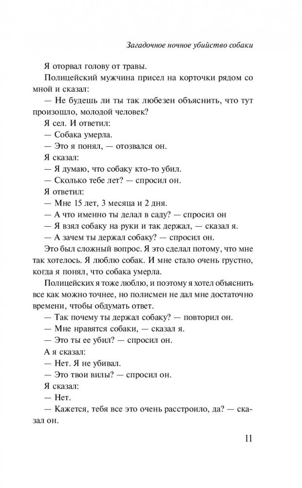 Пятнадцатилетний Кристофер Бун - аутист. Он талантливый математик и очень умный парень, вот только его цепкая память и живой ум совсем не помогают ему в жизни. Пока однажды, если быть точными, в семь минут первого ночи, его не застают на заднем дворе соседей. Рядом лежит обезображенный пес. Теперь Кристофер подозреваемый! Сможет ли мальчик провести расследование и доказать окружающим, что он не имеет никакого отношения к смерти беззащитного животного. Или имеет?