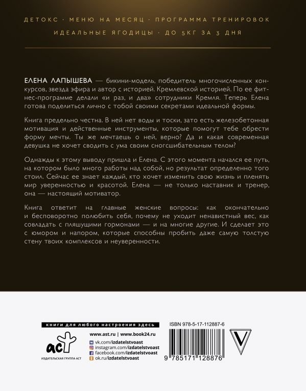 Елена Лапышева — бикини-модель, победитель многочисленных конкурсов, звезда эфира и автор с историей. Кремлевской историей. По ее фитнес-программе делали «и раз, и два» сотрудники Кремля. Теперь Елена готова поделиться лично с тобой своими секретами идеальной формы.