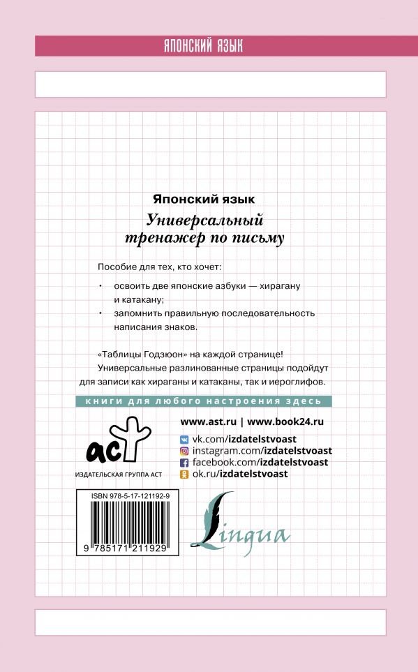 Это пособие не только поможет освоить две японские азбуки — хирагану и катакану, но и запомнить правильность написания. Универсальность тренажера в том, что на разлинованном пространстве вы сможете записывать и знаки азбуки, и иероглифы. На каждой странице сверху расположены памятки «Таблицы Годзюон».