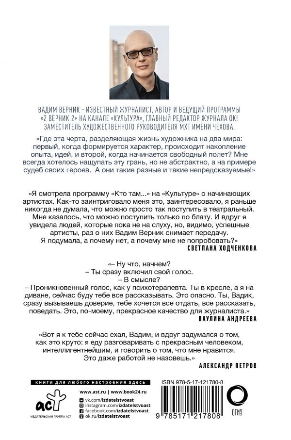 Вадим Верник – известный журналист, автор и ведущий программы "2 ВЕРНИК 2" на канале "Культура", главный редактор журнала ОК!, заместитель художественного руководителя МХТ имени Чехова. В книгу вошли эссе и беседы с известными актерами и режиссерами: Светланой Ходченковой, Елизаветой Боярской, Данилой Козловским, Юлией Пересильд, Иваном Ургантом, Константином Богомоловым, Аней Чиповской, Паулиной Андреевой, Александром Петровым и другими…