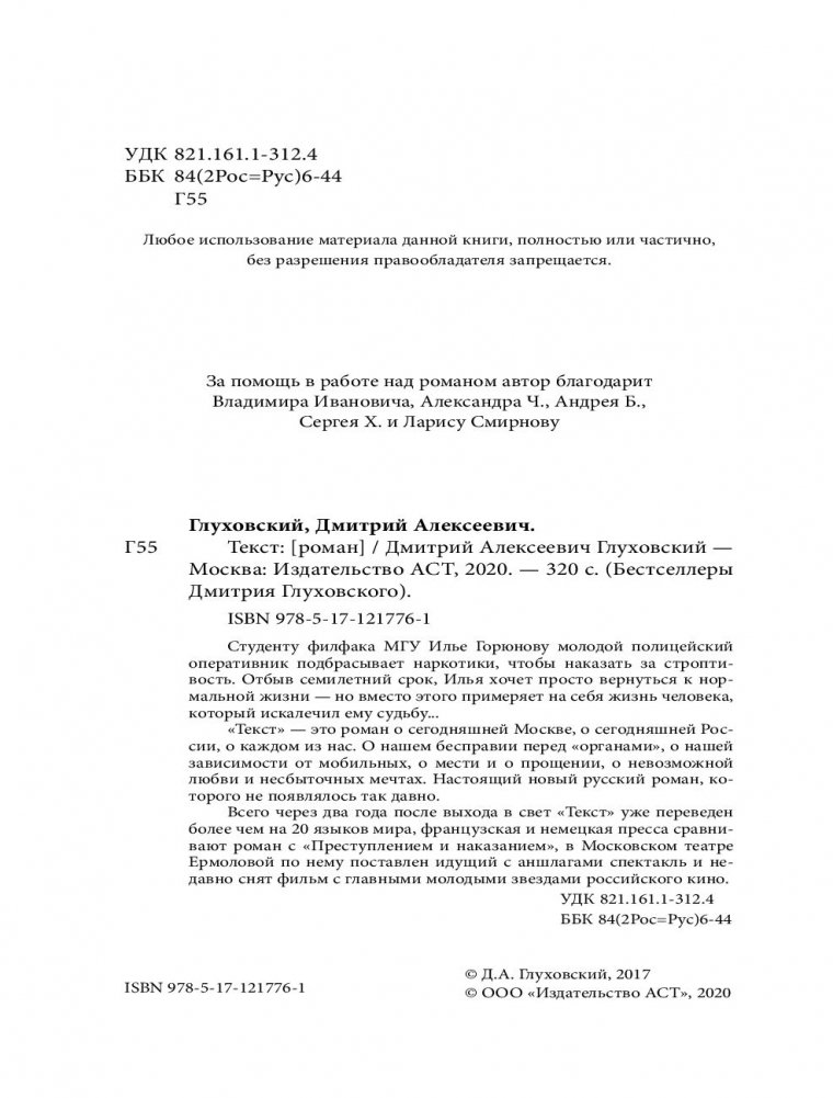 Всего через два года после выхода в свет «Текст» уже переведен более чем на 20 языков мира, французская и немецкая пресса сравнивают роман с «Преступлением и наказанием», в Московском театре Ермоловой по нему поставлен идущий с аншлагами спектакль и недавно снят фильм с главными молодыми звездами российского кино.