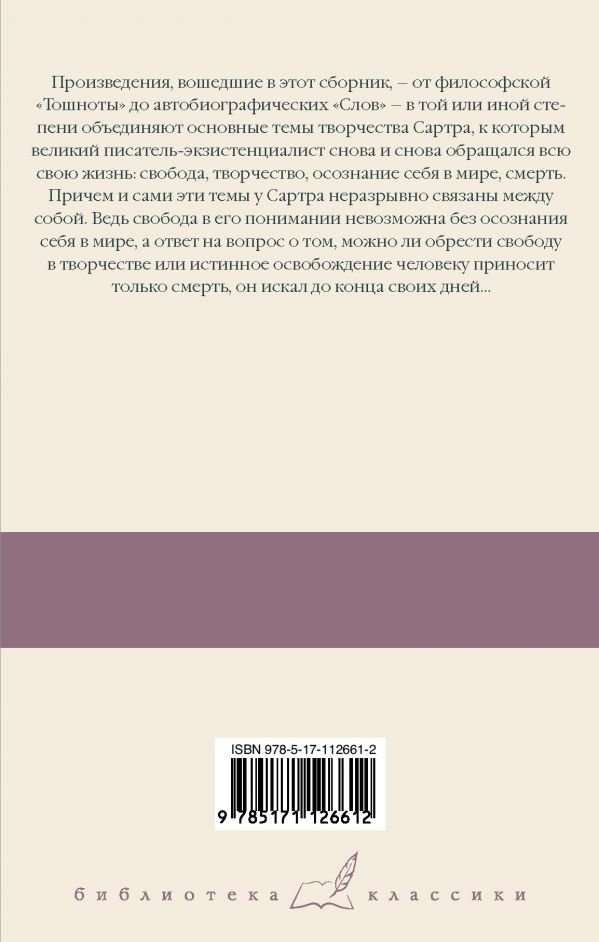 Произведения, вошедшие в этот сборник, – от философской "Тошноты" до автобиографических "Слов" – в той или иной степени объединяют основные темы творчества Сартра, к которым великий писатель-экзистенциалист снова и снова обращался всю свою жизнь: свобода, творчество, осознание себя в мире, смерть. Причем и сами эти темы у Сартра неразрывно связаны между собой. Ведь свобода в его понимании невозможна без осознания себя в мире, а ответ на вопрос о том, можно ли обрести свободу в творчестве или истинное освобождение человеку приносит только смерть, он искал до конца своих дней…