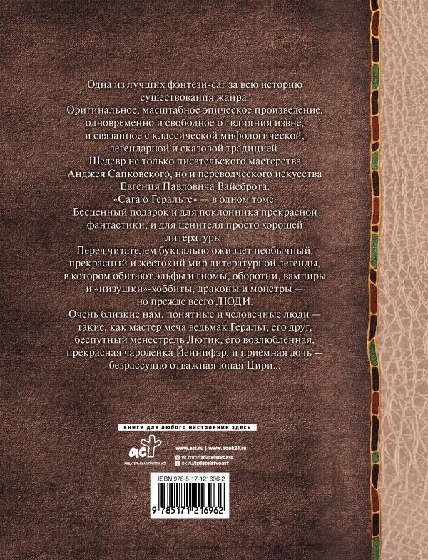 Одна из лучших фэнтези-саг за всю историю существования жанра. Оригинальное, масштабное эпическое произведение, одновременно и свободное от влияния извне, и связанное с классической мифологической, легендарной и сказовой традицией. Шедевр не только писательского мастерства Анджея Сапковского, но и переводческого искусства Евгения Павловича Вайсброта.