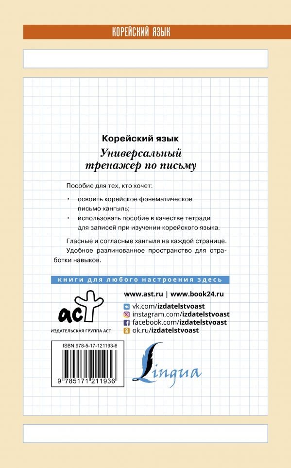 Это пособие не только поможет освоить корейское фонематическое письмо хангыль, но и окажется удобным для всех изучающих корейский язык. Универсальность данного издания заключается в том, что на разлинованном пространстве вы сможете тренироваться в написании гласных и согласных хангыля, а также использовать пособие в качестве тетради для записей при изучении корейского языка.