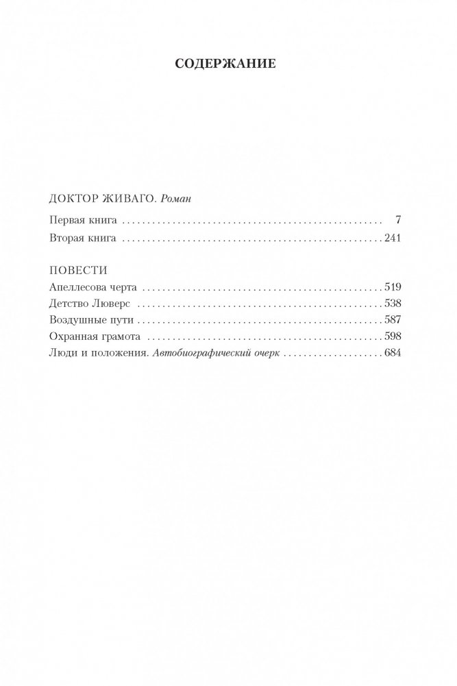 «Разве не лежит пропасть между прозой и поэзией? У Пастернака этой пропасти нет. Он объединял поэзию и прозу как единое искусство слова», — говорил академик Д.С. Лихачев. Ошеломляющая метафоричность, яркие образы и пронзительная одухотворенность — вот отличительные черты творчества Бориса Пастернака. Его произведения продолжают традиции русской и мировой классики, но при этом органично сочетают их с достижениями литературы Серебряного века и авангарда. В 1958 году Пастернак был удостоен Нобелевской премии по литературе «за значительные достижения в современной лирической поэзии, а также за продолжение традиций великого русского эпического романа». Для соотечественников присуждение премии оказалось прочно связано с романом «Доктор Живаго», опубликованным за рубежом. Политический скандал, вызванный этими событиями, быть может, стоил писателю жизни. В настоящее издание, помимо романа «Доктор Живаго», вошли повести «Апеллесова черта» (1918), «Детство Люверс» (1922), «Воздушные пути» (1924), «Охранная грамота» (1931), «Люди и положения» (1956), раскрывающие уникальный талант Пастернака-прозаика.