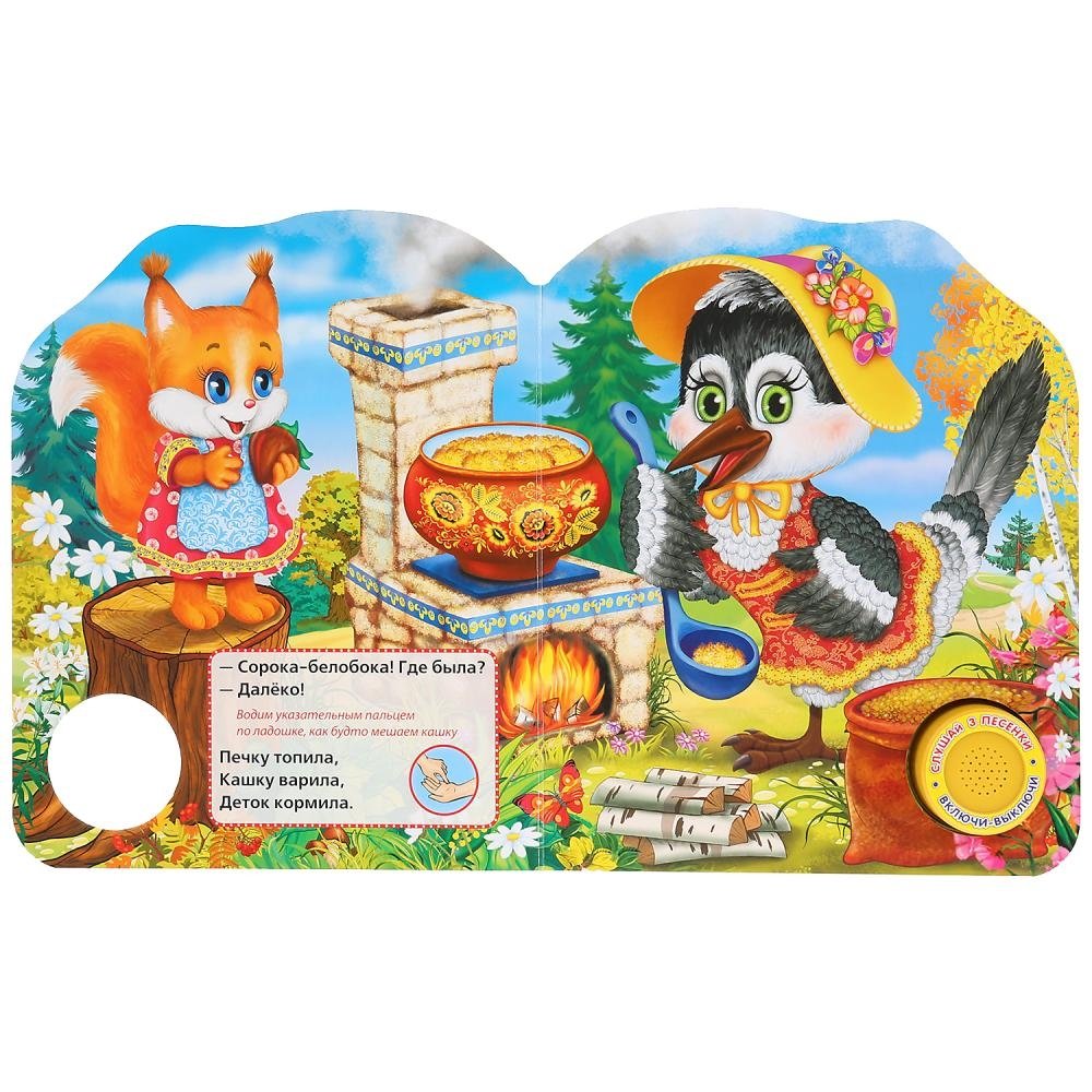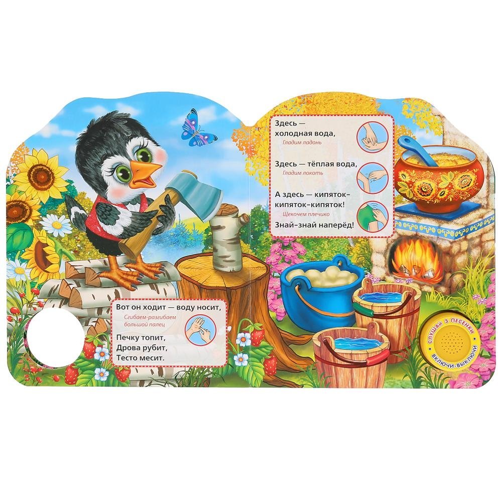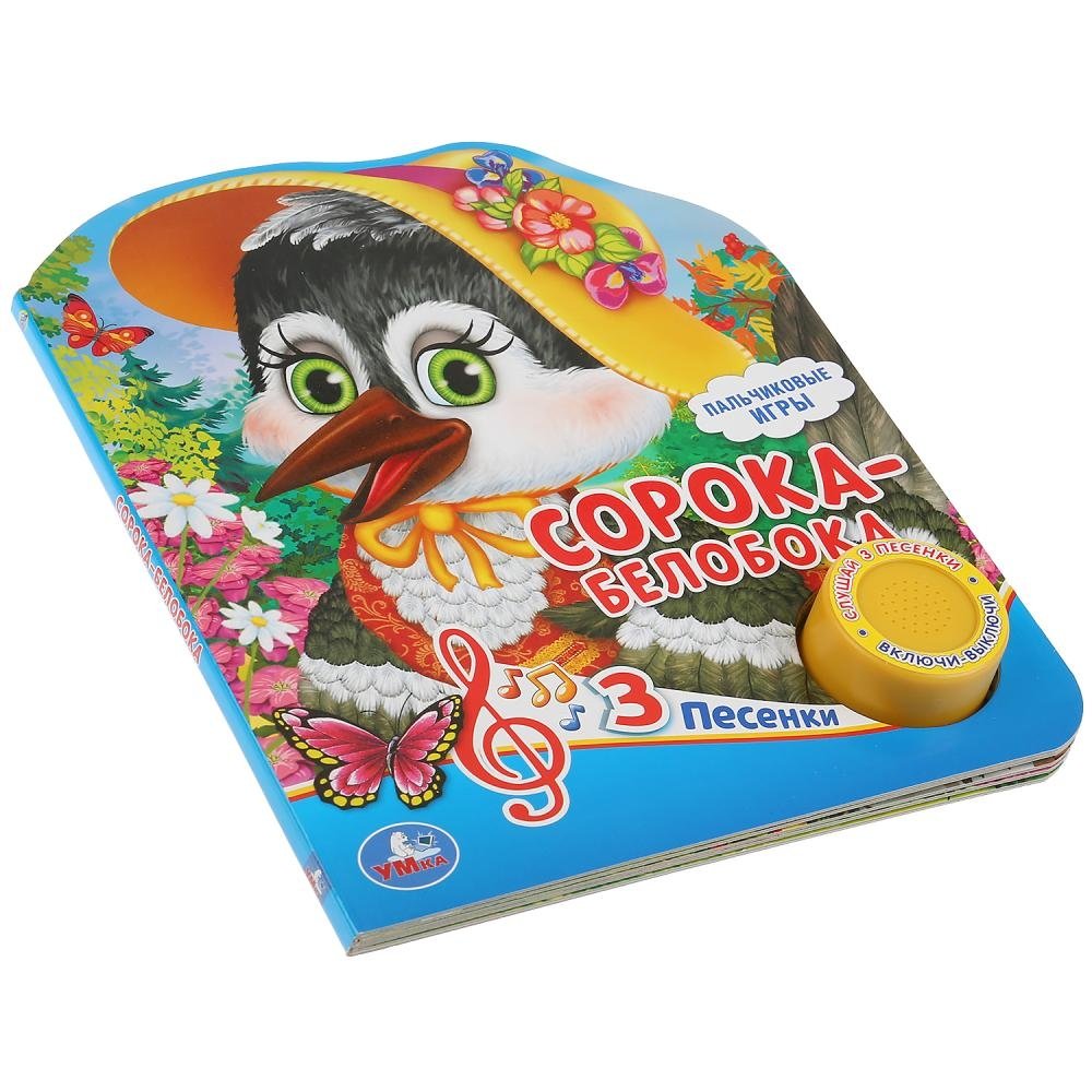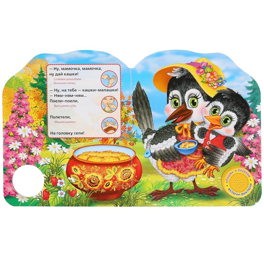 Компактная книга из прочного безопасного картона с кнопкой для прослушивания. Любимые авторы, народный фольклор, истории по мультфильмам, и конечно, 3 песенки!