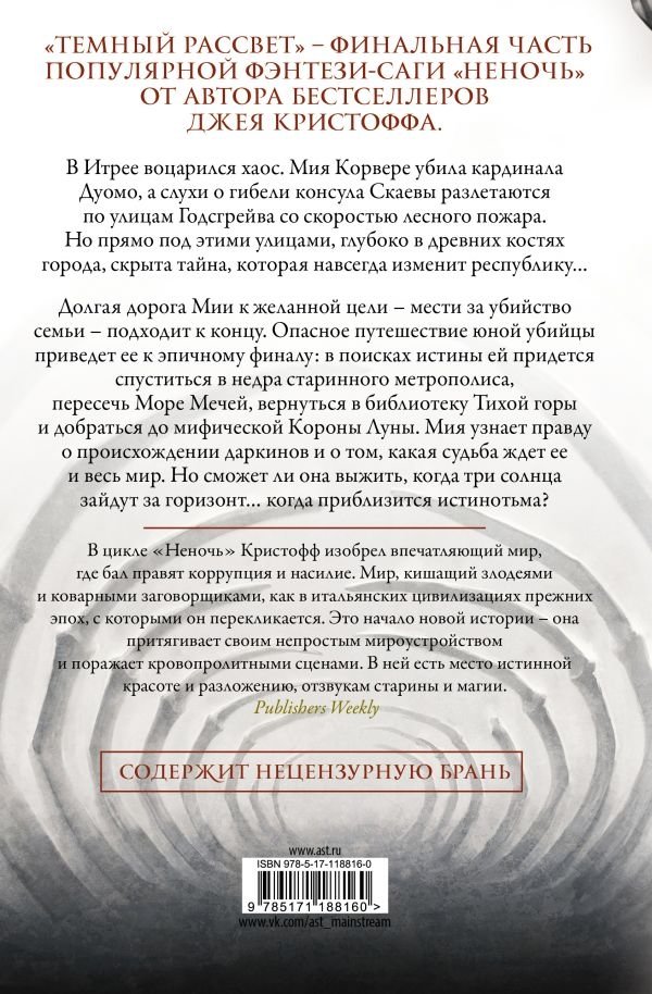 В Итрее воцарился хаос. Мия Корвере убила кардинала Дуомо, а слухи о гибели консула Скаевы разлетаются по улицам Годсгрейва со скоростью лесного пожара. Но прямо под этими улицами, глубоко в древних костях города, скрыта тайна, которая навсегда изменит республику… Долгая дорога Мии к желанной цели – мести за убийство семьи – подходит к концу. Опасное путешествие юной убийцы приведет ее к эпичному финалу: в поисках истины ей придется спуститься в недра старинного метрополиса, пересечь Море Мечей, вернуться в библиотеку Тихой горы и добраться до мифической Короны Луны. Мия узнает правду о происхождении даркинов и о том, какая судьба ждет ее и весь мир. Но сможет ли она выжить, когда три солнца зайдут за горизонт… когда приблизится истинотьма?