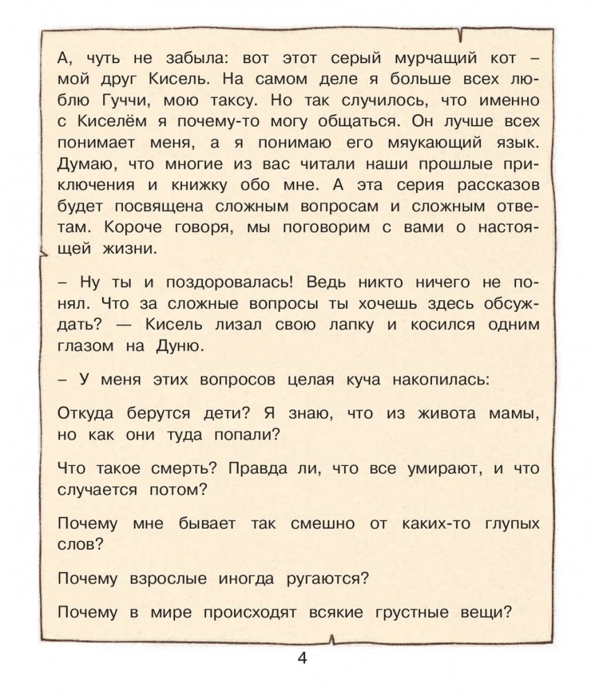 Дорогие читатели! Перед вами – новые истории от уже полюбившихся героев, девочки Дуни и кота Киселя, а значит – и новые терапевтические сказки на действительно важные и уже взрослые темы. Наши малыши растут, у них появляются другие вопросы и интересы, и многим родителям найти подходящие ответы уже не так легко, как раньше.
