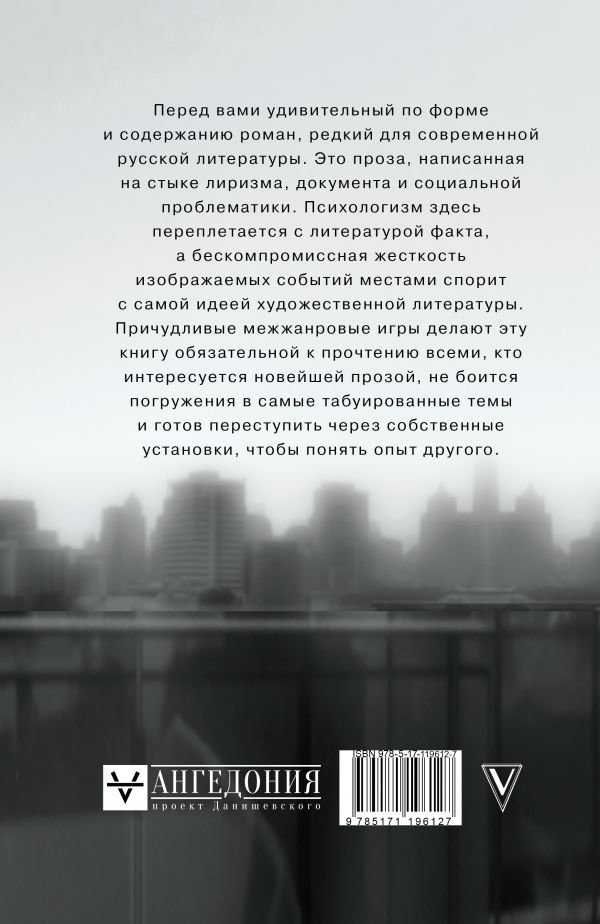 Перед вами удивительный по форме и содержанию роман, редкий для современной русской литературы. Это проза, написанная на стыке лиризма, документа и социальной проблематики. Психологизм здесь переплетается с литературой факта, а бескомпромиссная жесткость изображаемых событий местами спорит с самой идеей художественной литературы. Причудливые межжанровые игры делают эту книгу обязательной к прочтению всеми, кто интересуется новейшей прозой, не боится погружения в самые табуированные темы и готов переступить через собственные установки, чтобы понять опыт другого.