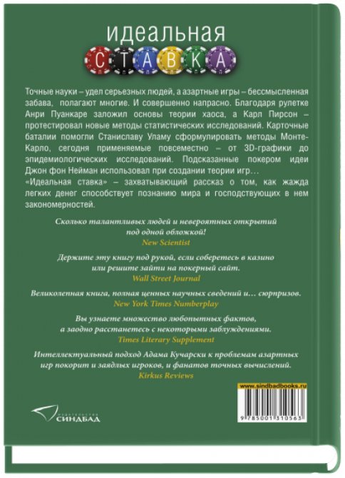 «Азартные игры – настоящая фабрика невероятных идей, поражающих своей оригинальностью и дерзостью» — убежден математик и журналист Адам Кучарски, рассказывающий в «Идеальной ставке» увлекательную историю обмена идеями между наукой и индустрией азартных игр.
