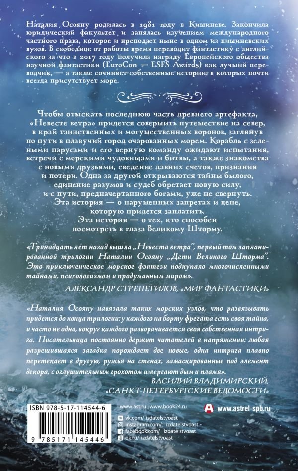 Чтобы отыскать последнюю часть древнего артефакта, "Невесте ветра" придется совершить путешествие на север, в край таинственных и могущественных воронов, заглянув по пути в плавучий город очарованных морем. Корабль с зелеными парусами и его верную команду ожидают испытания, встречи с морскими чудовищами и битвы, а также знакомства с новыми друзьями, сведение давних счетов, признания и потери. Одна за другой открываются тайны былого, единение разумов и судеб обретает новую силу, и с пути, предначертанного богами, уже не свернуть. Эта история — о нарушенных запретах и цене, которую придется заплатить. Эта история — о тех, кто способен посмотреть в глаза Великому Шторму.