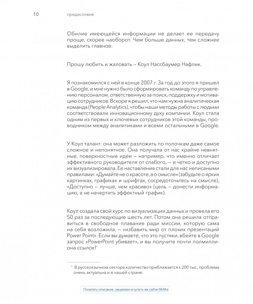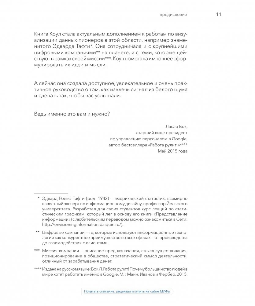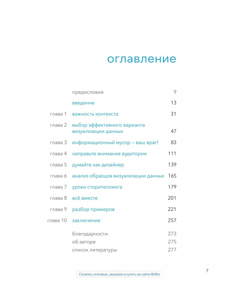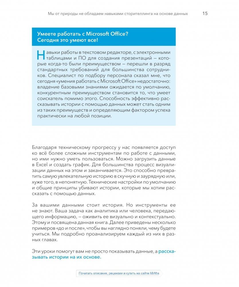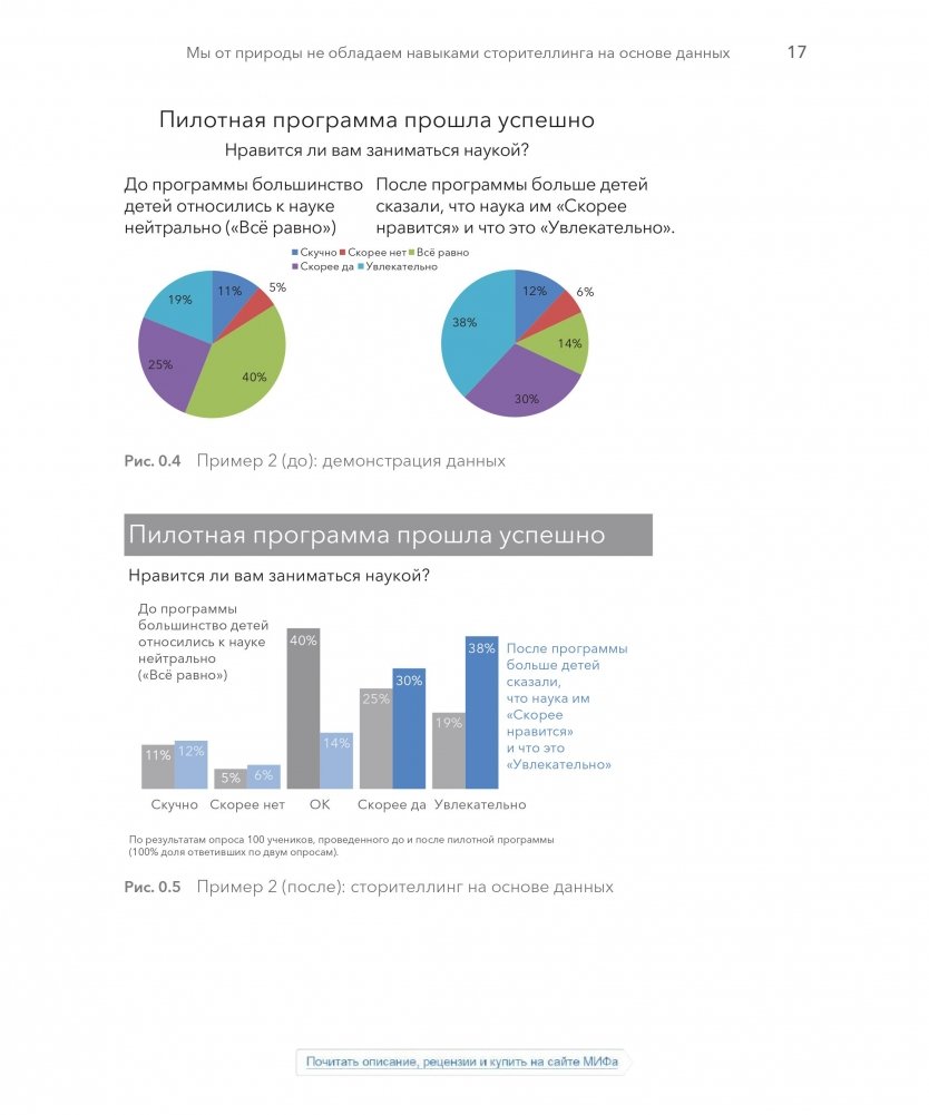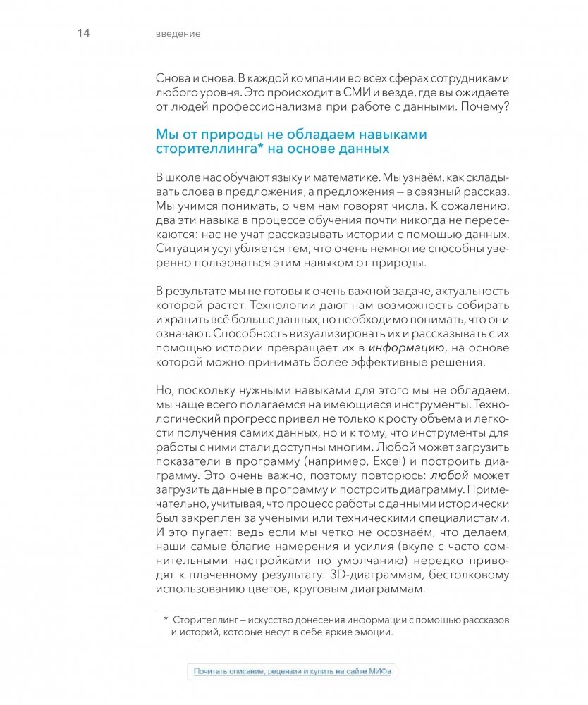 Эта книга научит вас основам визуализации данных и тому, как эффективно взаимодействовать с ними. Вы откроете для себя силу повествования и способ сделать данные ключевым моментом в вашей истории. Уроки в этой книге основаны на теории, но просты и понятны благодаря многочисленным примерам из реальной жизни; их можно без труда применить в вашей презентации.
