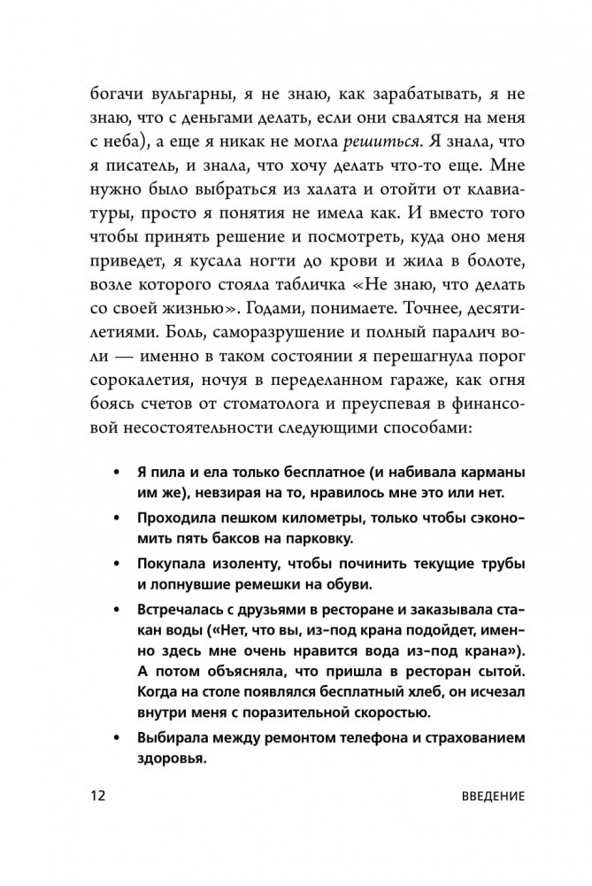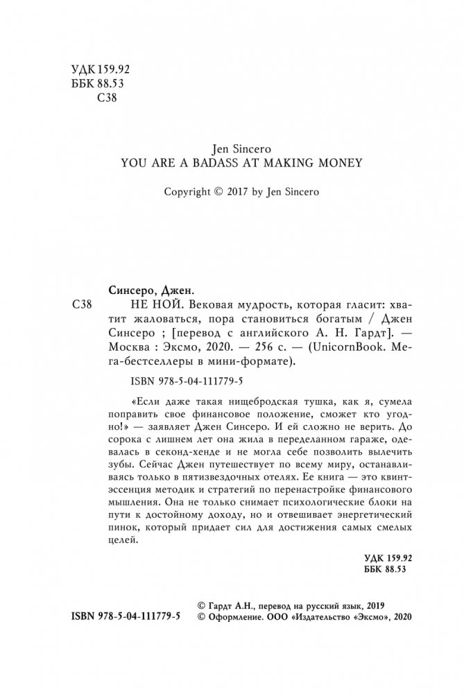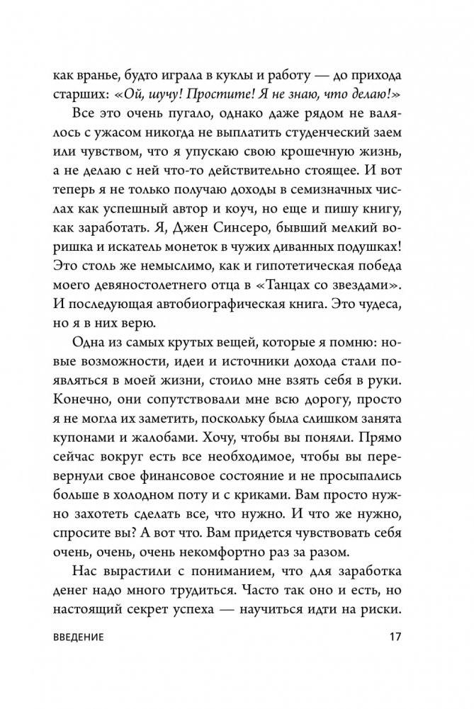 "Если даже такая нищебродская тушка, как я сумела поправить свое финансовое положение, сможет кто угодно!" - заявляет Джен Синсеро. И ей сложно не верить. До сорока с лишнем лет она жила в переделанном гараже, одевалась в секонд-хэнде и не могла себе позволить вылечить зубы. Сейчас Джен путешествует по всему миру, останавливаясь только в пятизвездочных отелях. Ее книга – это квинтэссенция методик и стратегий по перенастройке финансового мышления. Она не только снимает психологические блоки на пути к достойному доходу, но и отвешивает энергетический пинок, который придает сил для достижения самых смелых целей.