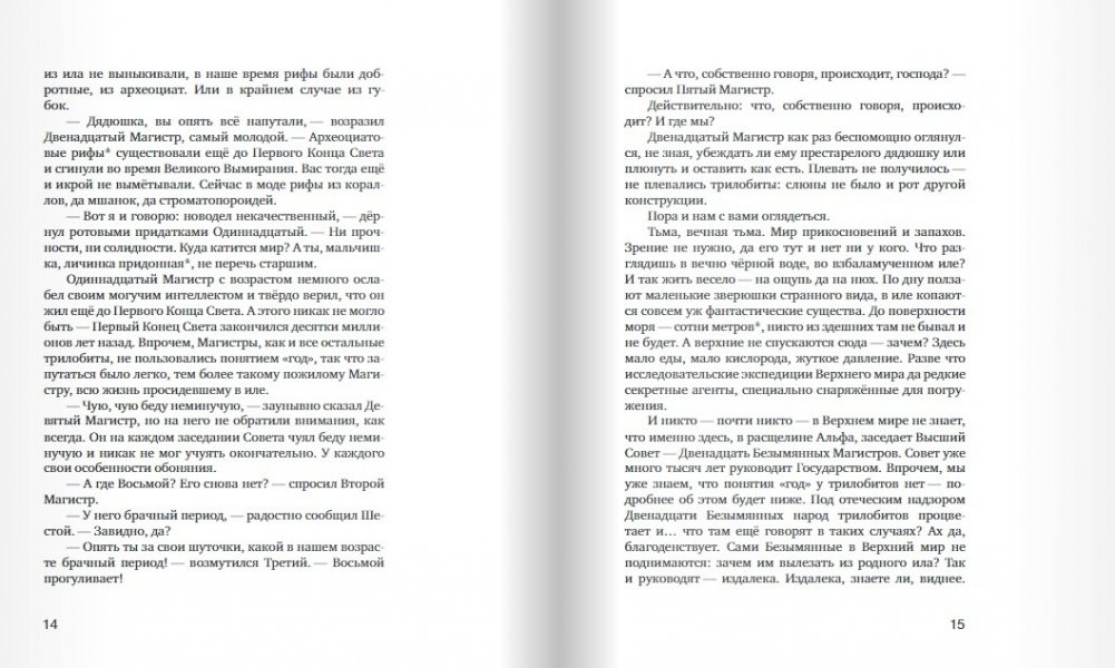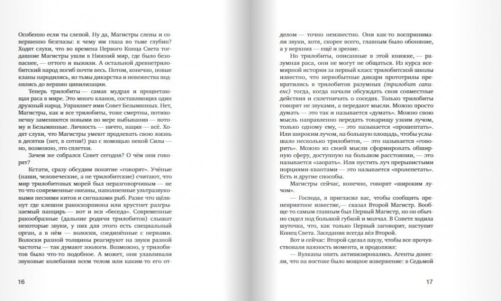 Эти самые трилобиты стали героями захватывающей повести Светланы Лавровой. В секретной школе трилобитов заседают двенадцать магистров: приближается ледниковый период. Четверо юных учеников отправлены на поиск средства от Второго конца света. Ледниковый период всё равно наступит, но юные разведчики сделают много открытий. Откуда и куда движется похолодание, у кого какие шансы выжить, можно ли отсрочить катастрофу и как. А также докажут, что мир живых существ не делится на первых и последних: для жизни на планете важны все!