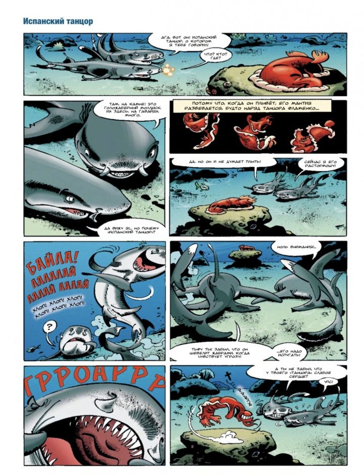 Новый том - новые герои! Да ещё какие: испанский танцор, индийский стеклянный сомик, африканский протоптер, карибский колючий лангуст, австралийские морские лисицы... Целое кругосветное путешествие, причём не выходя из дома! Как всегда, авторы серии "Морские животные в комиксах", сценарист Кристоф Казнов и художник Житери, остаются верны своим принципам, главный из которых - "Развлекая, обучать!". Поэтому кроме забавных (пусть иной раз и подлинно драматических - вроде казуса с рогатым кузовком, потерявшим ключ... от своего панциря!) историй из жизни морских обитателей, вы узнаете о том, как гражданская наука буквально каждый день помогает изучать и защищать бескрайний, но такой хрупкий подводный мир.