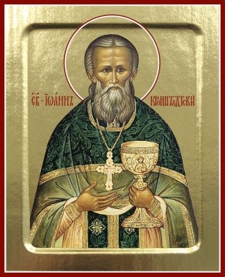 Икона праведного Иоанна Кронштадтского на дереве. Техника изготовления: заготовка из липовой доски обрабатывается вручную, глубина ковчега 1,5-2,0 мм. После нанесения подготовительного грунта заготовка покрывается поталью (имитация сусального золота). Изображение иконы наносится современной светоотражаемой пигментной краской и защищается лаковым покрытием.