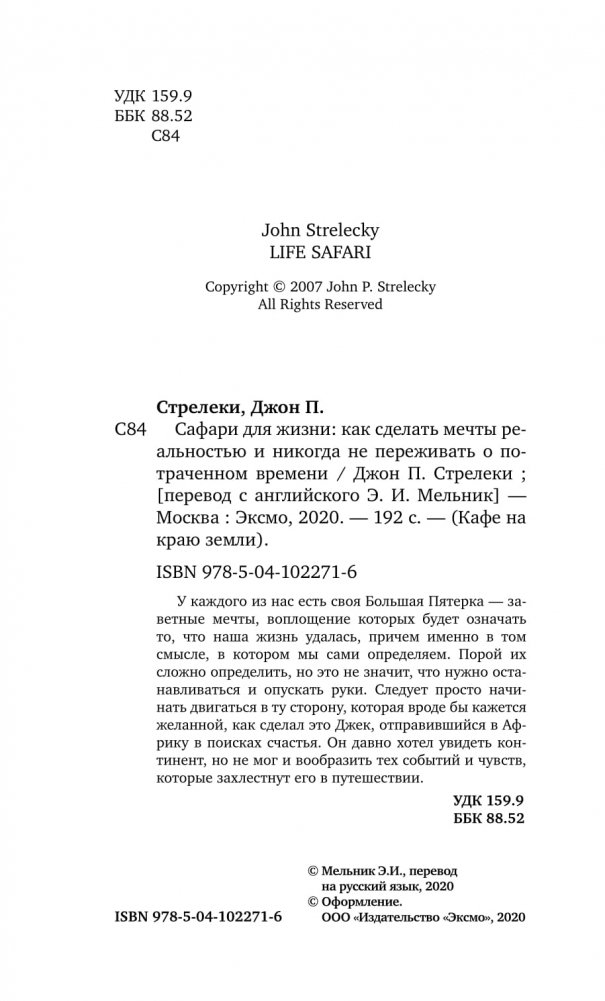 У каждого из нас есть своя Большая Пятерка - заветные мечты, воплощение которых будет означать то, что наша жизнь удалась, причем именно в том смысле, в котором мы сами определяем. Порой их сложно определить, но это не значит, что нужно останавливаться и опускать руки. Следует просто начинать двигаться в ту сторону, которая вроде бы кажется желанной, как сделал это Джек, отправившийся в Африку в поисках счастья. Он давно хотел увидеть континент, но не мог и вообразить тех событий и чувств, которые захлестнут его в путешествии.