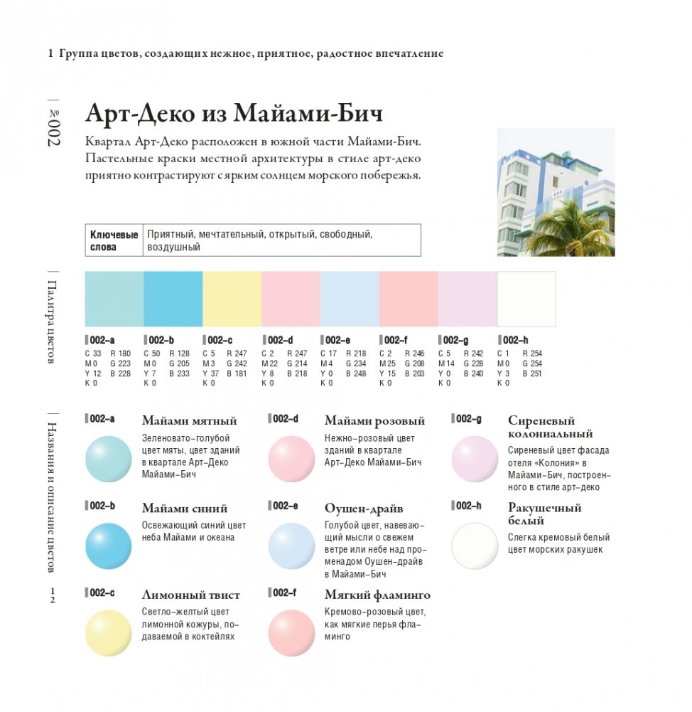 Книга включает описания 125 цветовых палитр, каждая из которых соотносится с определенной темой или категорией. В состав этих палитр входит около 1100 отдельных цветов с указанием их кодов по системам CMYK и RGB. Также вы найдете здесь более 2500 уникальных образцов цветовых комбинаций, полученных путем сочетания цветов из палитры по два, по три, по четыре и по пять. Каждая палитра сопровождается четкими характеристиками составляющих ее цветов и важными замечаниями по их возможным сочетаниям.