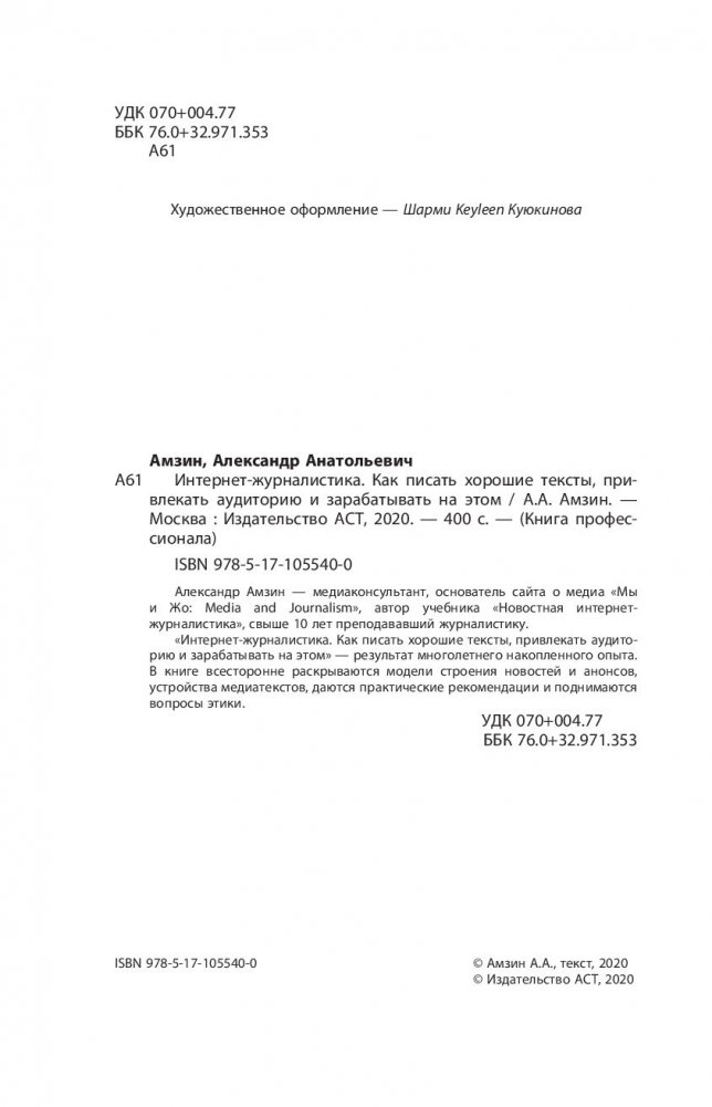 «Интернет-журналистика. Как писать хорошие тексты, привлекать аудиторию и зарабатывать на этом» – результат многолетнего накопленного опыта. В книге всесторонне раскрываются модели строения новостей и анонсов, устройства медиатекстов, даются практические рекомендации и поднимаются вопросы этики.
