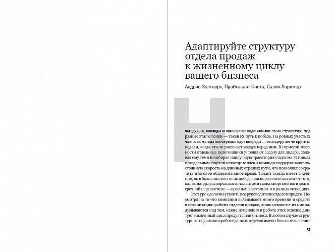 Вы узнаете, как адаптировать структуру отдела продаж к жизненному циклу вашей компании, оптимально использовать возможности микрорынков и выявить влиятельных участников закупочного центра при крупных сделках. Разберетесь, чем плохи продажи решений и как выиграть сделку за счет решающего фактора. В этом сборнике также рассматриваются вопросы, связанные с управлением отделом продаж. Как сделать так, чтобы ваши отделы продаж и маркетинга начали слаженно работать? Сколько специалистов по продажам нужно, чтобы получить максимальную прибыль? Как мотивировать ваших менеджеров и правильно использовать систему вознаграждений за успешные сделки?