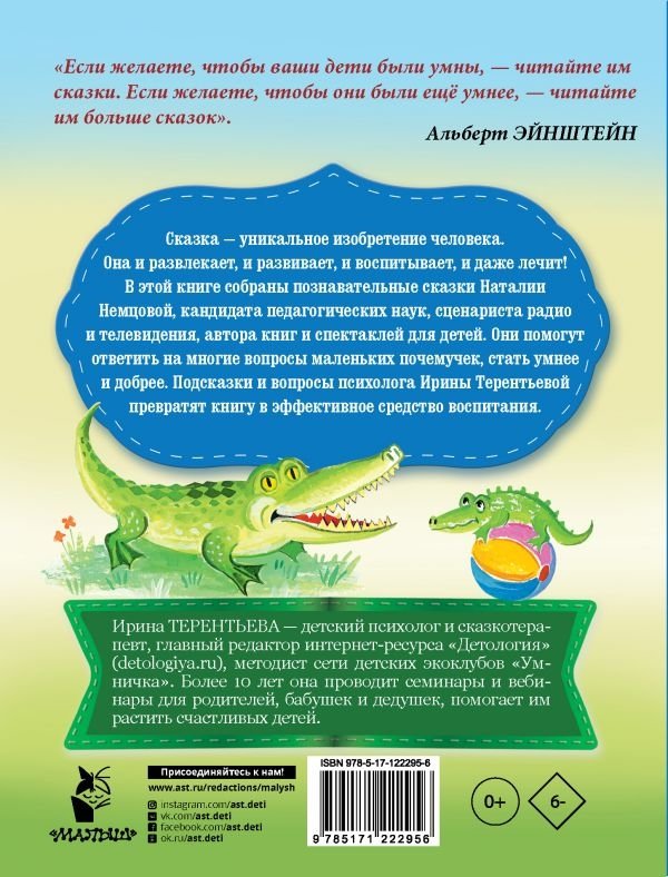 Сказка — уникальное изобретение человека. Она и развлекает, и развивает, и воспитывает, и даже лечит! В этой книге собраны познавательные сказки Наталии Немцовой, кандидата педагогических наук, сценариста радио и телевидения, автора книг и спектаклей для детей. Они помогут ответить на многие вопросы маленьких почемучек, стать умнее и добрее. Подсказки и вопросы психолога Ирины Терентьевой превратят книгу в эффективное средство воспитания.