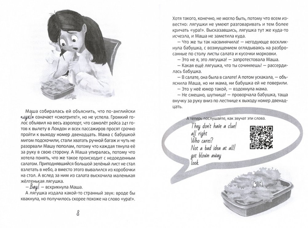 Захватывающая и смешная история о двуязычной девочке Маше-Роберте и ее друге, говорящем лягушонке, не только развлечет детей, но и незаметно поможет им в изучении английского языка: каждую главу сопровождает аудиофайл со встречающимися в тексте сказки словами и выражениями, записанными юной носительницей языка.
