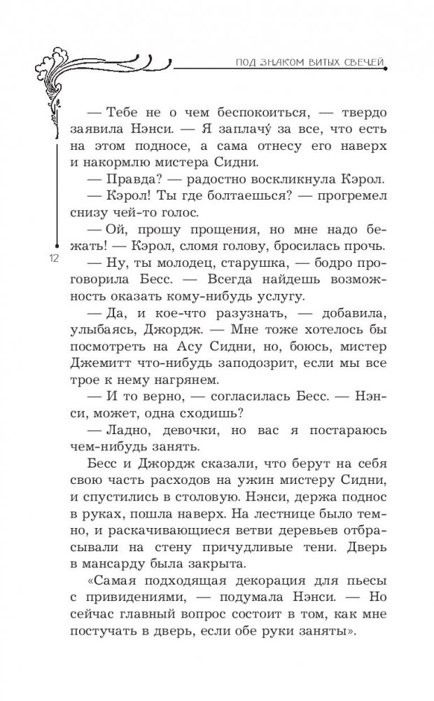 «Нэнси Дрю и знак витых свечей» – продолжение классической детективной серии книг о расследованиях знаменитой сыщицы Нэнси Дрю. В этой книге лучшие подруги Нэнси Джордж и Бесс просят юную сыщицу разузнать подробно об их родственнике – старике Асе Сидни, который безвылазно живет в башне гостиницы «Витые свечи». Хозяева гостиницы говорят, что Аса не хочет никого видеть, но так ли это на самом деле?