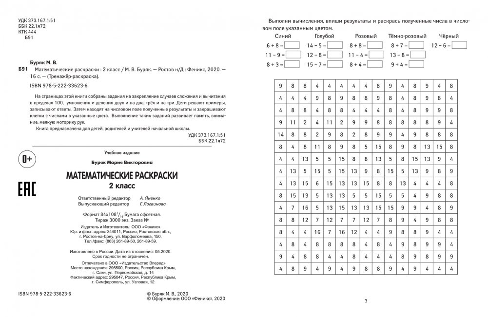 На страницах этой книги собраны задания на закрепление случаев сложения и вычитания в пределах 100. умножения и деления двух и на два, трёх и на три. Дети решают примеры, записывают ответы. Затем находят на числовом поле полученные результаты и закрашивают клетки с числами в указанные цвета. Выполнение таких заданий развивает память, внимание, мелкую моторику рук.
