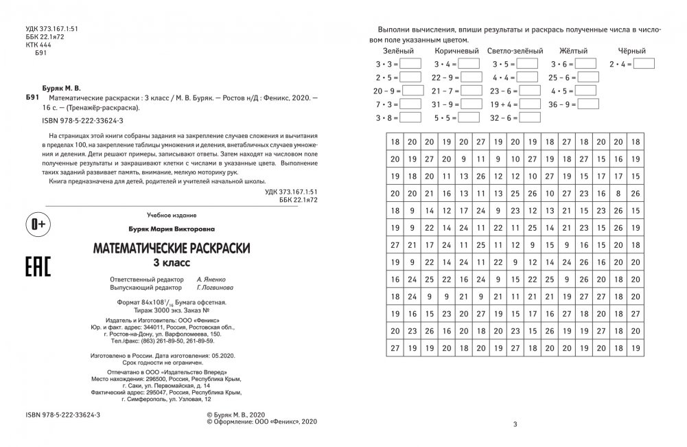 На страницах этой книги собраны задания на закрепление случаев сложения и вычитания в пределах 100. на закрепление таблицы умножения и деления, внетабличных случаев умножения и деления. Дети решают примеры, записывают ответы. Затем находят на числовом поле полученные результаты и закрашивают клетки с числами в указанные цвета. Выполнение таких заданий развивает память, внимание, мелкую моторику рук.