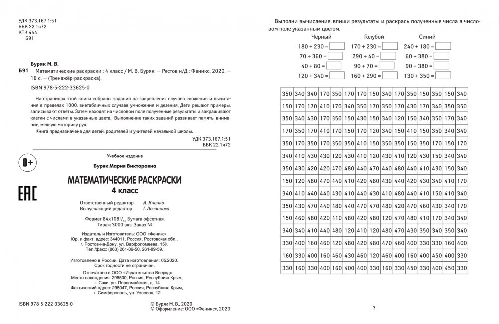 На страницах этой книги собраны задания на закрепление случаев сложения и вычитания в пределах 1000, внетабличных случаев умножения и деления. Дети решают примеры, записывают ответы. Затем находят на числовом поле полученные результаты и закрашивают клетки с числами в указанные цвета. Выполнение таких заданий развивает память, внимание, мелкую моторику рук.