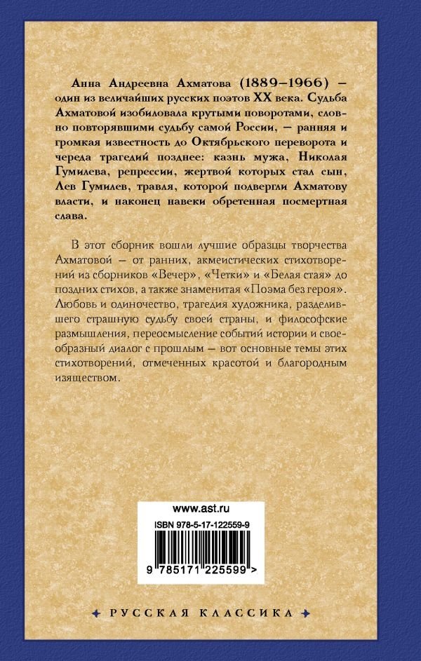 В этот сборник вошли лучшие образцы творчества Ахматовой – от ранних акмеистических стихотворений из сборников «Вечер», «Четки» и «Белая стая» до поздних стихов, а также знаменитая «Поэма без героя». Любовь и одиночество, трагедия художника, разделившего страшную судьбу своей страны и философские размышления, переосмысление событий истории и своеобразный диалог с прошлым – вот основные темы этих стихотворений, отмеченных красотой и благородным изяществом.