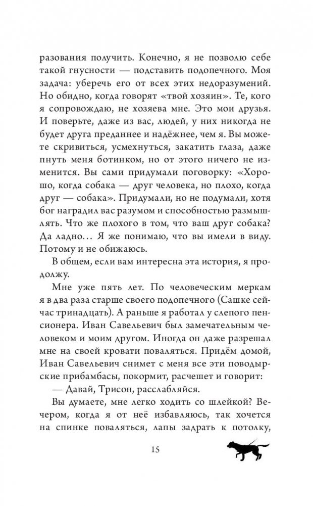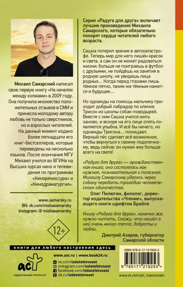 Сашка потерял зрение в автокатастрофе. Теперь мир для него лишён красок и света, а сам он не может радоваться жизни: больше не поиграешь в футбол с друзьями, не пойдёшь на занятия в родную школу, не увидишь лица родных... Когда перед глазами лишь тёмное пятно, таким же тёмным кажется и будущее... Но однажды на помощь мальчику приходит лабрадор по кличке Трисон из школы собак-поводырей. Вместе с ним Сашка учится жить заново, и вскоре на него лице опять появляется улыбка. И всё бы ничего, но однажды Трисона похищают. Верный пёс сделает всё возможное, чтобы вернуться к своему подопечному, ведь сейчас он нужен ему больше всего на свете!
